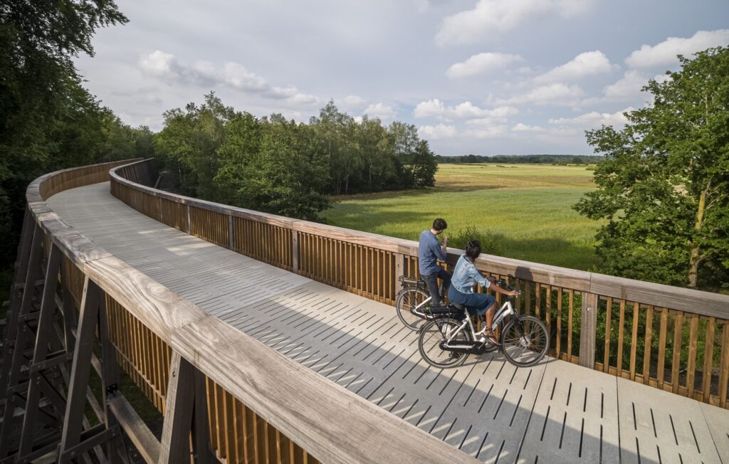 Ubicado en la provincia belga de Limburgo, se emplaza una red de ciclismo turístico conocida como “Cycling Throught the Heathland”. Formado por columnas y vigas de madera entrelazada de pino local.