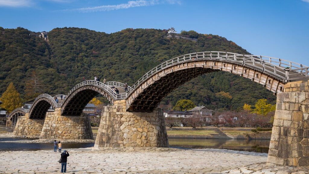 Ubicado a los pies del monte Yokohama en la localidad de Iwakuni, el proyecto de madera más bello del mundo. Fue declarado monumento nacional en 1922 y está compuesto por cinco aros de madera sobre pilares del mismo material.