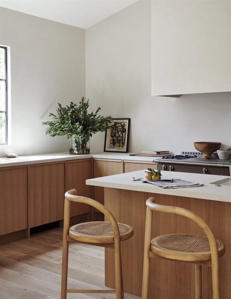 En tonos maderas y pasteles, esta cocina escapa de la urbanidad de Los Ángeles para abrazar la naturalidad a través de los tonos claros, los suelos de roble y los muebles de madera clara. La campana extractora, en tonos grises, se une al estilo de las paredes.