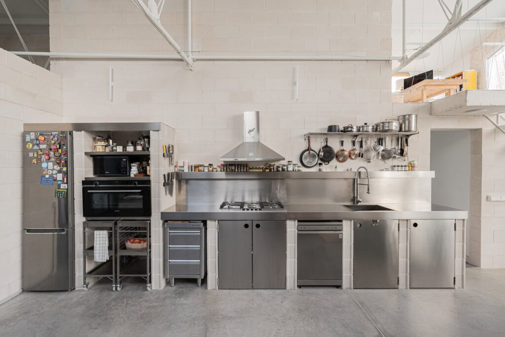 Con la mayoría de los artefactos y muebles en acero inoxidable, esta cocina española evoca al estilo industrial que contrasta, al mismo tiempo, con un muro de mampostería de hormigón blanco que sirve como un gran marco para el gris brillante que es protagonista.