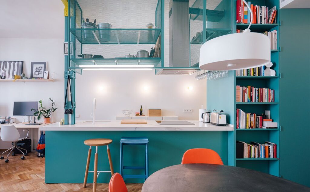 En un departamento de Madrid, esta cocina reboza de color y estilo. Con el tono verde como principal tono, este espacio se integra con tres mesadas estratégicamente ubicadas a un salón y estudio que siguen en mismo diseño de interiorismo.
