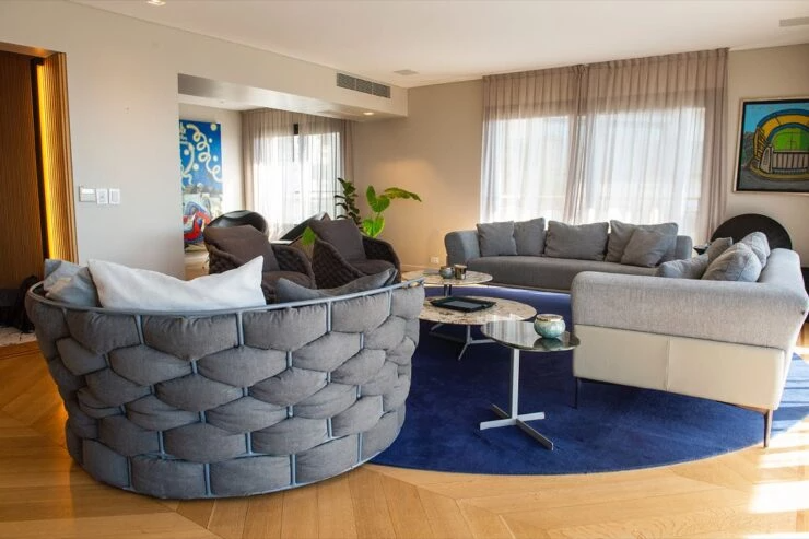 Sillones de líneas contemporáneas y combinados con estructuras geométricas y rectas se observan en el living. Con una paleta gris y sus gamas, el color azul eléctrico y otros tonos más fuertes completan la composición.