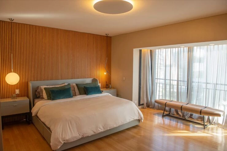 El dormitorio de este departamento tiene un revestimiento varillado de roble americano que le da un respaldo a la cama y sus mesas de luz. En ambos casos se usó madera laqueada gris claro.