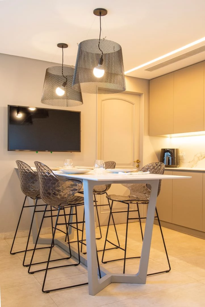 Este ambiente reciclado, moderno y funcional es totalmente blanco. De formato pasillo posee una larga mesada, con banquetas y dos luminarias colgantes que completan la decoración.