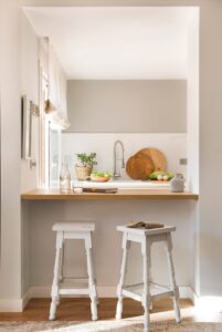 La solución perfecta para espacios extremadamente reducidos, una barra desayunadora plegable combina funcionalidad con eficiencia de espacio. Este tipo de barra se monta en la pared y se puede plegar cuando no está en uso, liberando espacio para otras actividades. Su diseño inteligente la hace ideal para ambientes  pequeños o cocinas con espacio limitado. Un tip a tener en cuenta buscá aquellas con estantes adicionales o ganchos para colgar utensilios, maximizando así su utilidad.