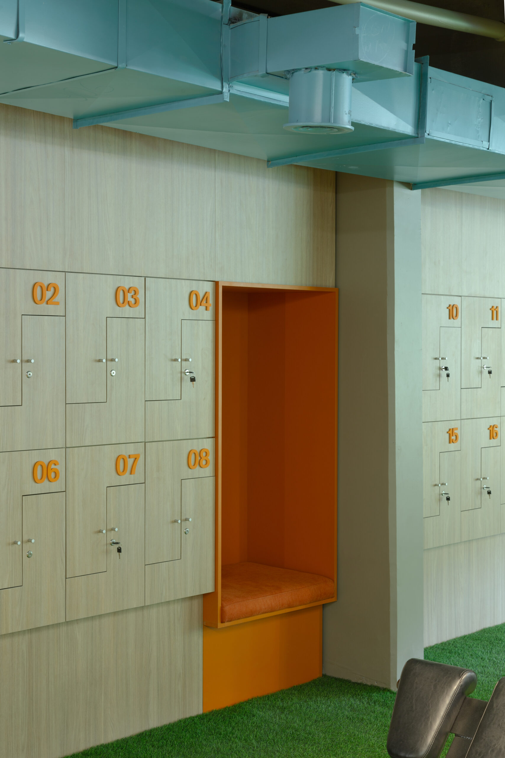 Desde el acceso, un túnel inmersivo envuelve a quien llega desde el exterior, en luz y color, preparando cuerpo y mente para la actividad física, y reactivando los sentidos. En el interior, el equilibrio entre madera, negro y tonos eléctricos genera un ambiente moderno y estimulante, mientras que lockers, diseñados a medida, crean un juego visual con sus formas disruptivas, aportando un carácter lúdico y alegre al espacio.