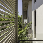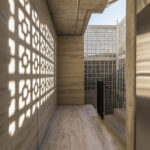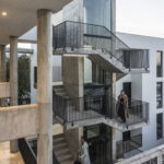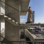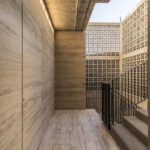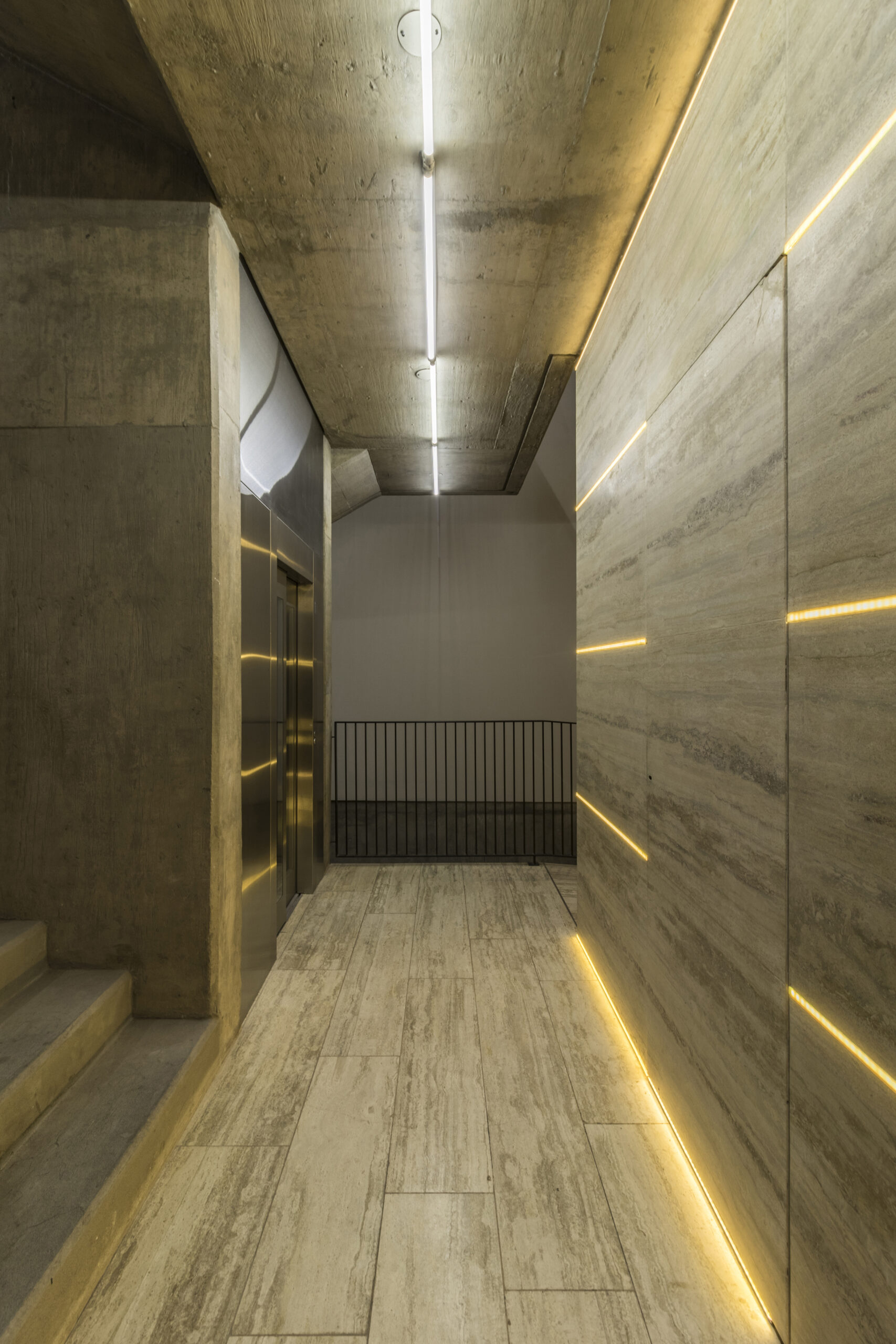 - Materialidad: hormigón visto, piedra travertina, aluminio en parasoles. Metálico en barandas.
