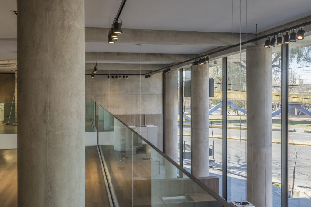 “El diseño arquitectónico se concibió como un gran volumen superior de hormigón armado, provisto de parasoles de aluminio de doble altura, que parece flotar sobre un ritmo de columnas circulares. Esto permite crear un espacio integrado y abierto hacia el exterior, donde se desarrolla el local comercial principal”, contó la arquitecta.
