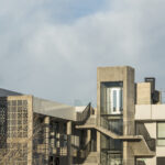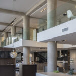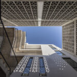 Por su lado, en la fachada oeste, un imponente volumen de hormigón marca el acceso al edificio, generando un enmarque de cuatro niveles de altura.