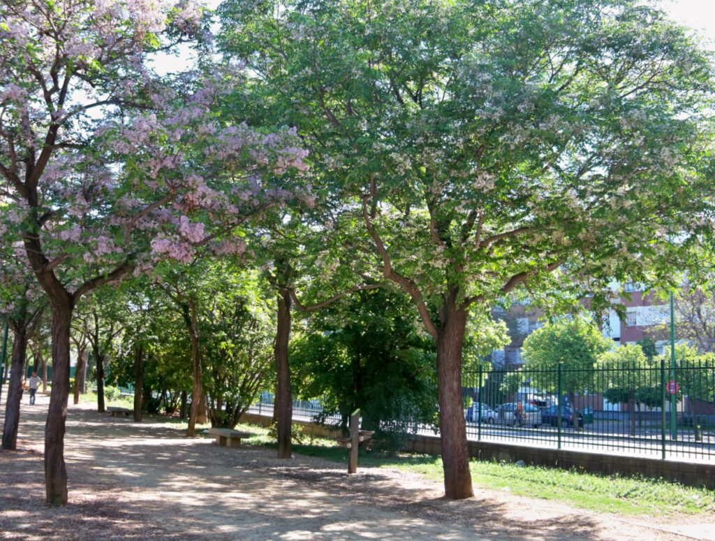 El paraíso destaca por sus flores lilas intensamente perfumadas que aparecen en primavera. Este árbol de crecimiento rápido tolera extraordinariamente bien la sequía y las bajas temperaturas. Su follaje caduco proporciona sombra densa en verano y permite el paso de luz solar en invierno, optimizando el confort de los espacios.