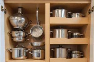 -Estanterías abiertas: Funcionan como pequeñas repisas modulares donde las ollas se pueden apilar en vertical, optimizando las esquinas o el interior de cajones profundos.