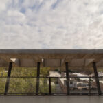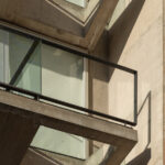 Por su lado, la estructura y envolvente principal se resuelven en hormigón armado a la vista, cuya textura y color natural aportan carácter y coherencia a todo el conjunto, mientras que las carpinterías de aluminio y las barandas de vidrio completan el sistema constructivo, permitiendo la entrada generosa de luz natural y reforzando la sensación de transparencia.