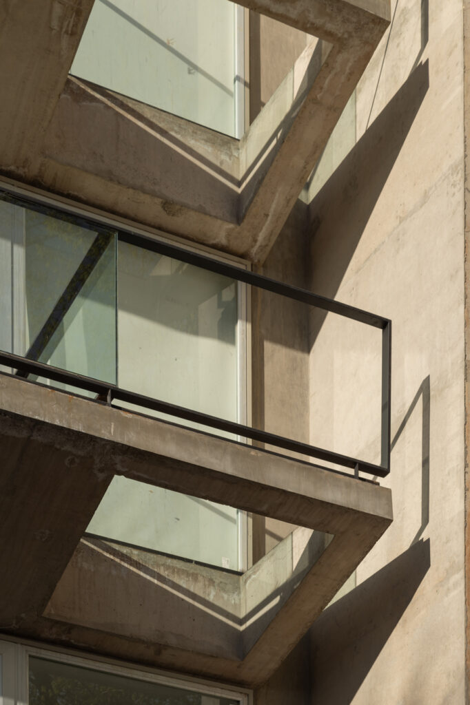 Cada departamento se desarrolla en torno a amplios balcones al frente y contrafrente, que amplían visual y funcionalmente los espacios interiores, proponiendo una fuerte conexión con el exterior. En el último nivel, el alero de hormigón corona el edificio y filtra la luz, aportando ritmo y profundidad a la fachada.