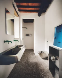 - Colores atrevidos: Los colores en este tipo de baño no temen ser protagonistas: negros profundos, borgoñas intensos, o verde botella se usan en paredes o muebles. La grifería, a menudo en acabados poco convencionales como el negro mate o el níquel cepillado, complementa esta paleta de alto contraste.