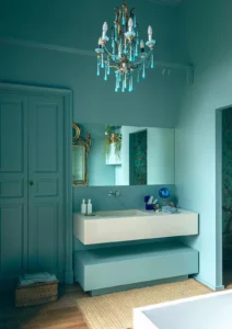 - Características: Se abandona la uniformidad del blanco o beige en favor de colores profundos o saturados, aplicados en secciones específicas. Esto podría ser una pared completa en terracota contrastada con un piso en gris grafito, o gabinetes azul zafiro combinados con un revestimiento de mármol claro.