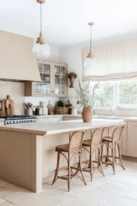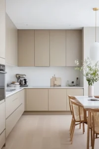-Confort táctil y visual (calidez): A diferencia de las opciones frías como los grises intensos o los blancos puros, el tono arena irradia abrigo . Proporciona una sensación de bienestar inmediato, envolviendo la estancia en una atmósfera de hogar y hospitalidad, esencial para un espacio de reunión como la cocina.