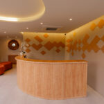 La madera natural, muros empastados neutros y mobiliario con morfología curva, generan un espacio luminoso y agradable, para dar la bienvenida al huésped. Una apuesta que apunta a que apenas se traspasan las puertas del hotel, la persona pueda sentirse “abrazada” por cada una de las sensaciones que evocan los elementos.