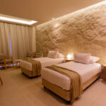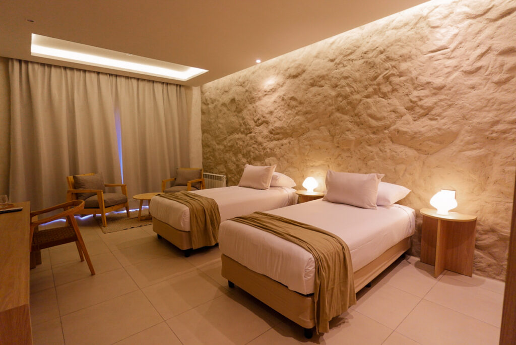Otro detalle ligado a lo natural tiene que ver con las habitaciones, ya que como bien apuntan los arquitectos, “debían ser versátiles en la disposición de las camas, y decidimos no realizar cabeceros . Lo que creamos fue un muro de apoyo de las camas, como un ‘gran cabecero’ realizado en revoque con mucho relieve, elaborado artesanalmente simulando la roca y el barro. Utilizamos estucado en tonos claros en todos los muros y madera clara”.