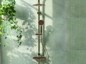 La experiencia sensorial comienza con el agua. Una grifería termostática es esencial, ya que permite fijar la temperatura ideal y evitar cambios bruscos o quemaduras accidentales. Lo ideal es contar con un sistema dual: un rociador fijo con efecto lluvia para el relax, y un artefacto de mano con soporte regulable en altura, facilitando el lavado en distintas posiciones.