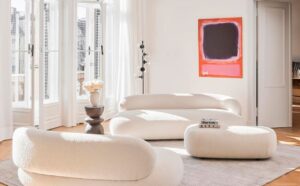 Las líneas y ángulos rectos están cediendo su lugar a formas orgánicas y envolventes. Esta tendencia, que comenzó como un guiño al diseño mid-century, ha evolucionado hacia estructuras más audaces y escultóricas.