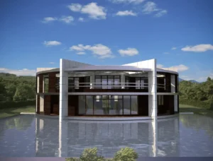 Integración del agua: La piscina que rodea parte de la estructura no es solo decorativa; actúa como un regulador térmico natural.