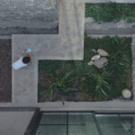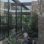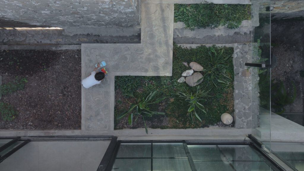 La combinación de luz natural, vegetación y sonido construye una atmósfera controlada, donde el vacío central actúa como elemento articulador de las distintas cualidades sensoriales del conjunto.